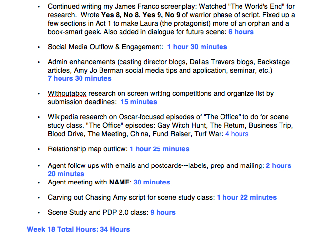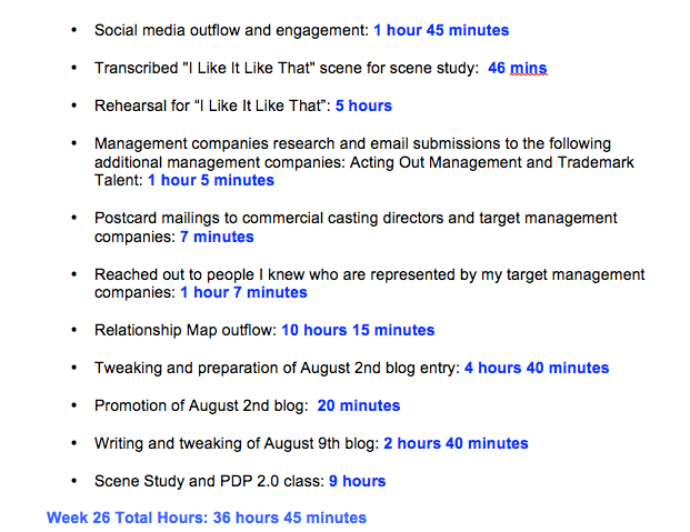 “I’m always so impressed when I see the breakdown of what you’ve done, the minutes, the hours. So just something to consider for your blog in the future is: Taking a screenshot of your week, broken down, so that you’re not just sharing these experiences, but this is evidence of the hustle. Cause it inspires us and I know it will inspire others.”