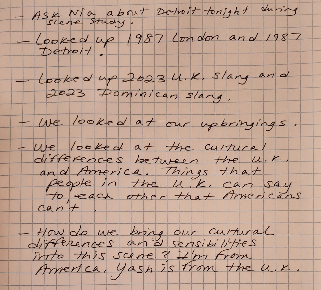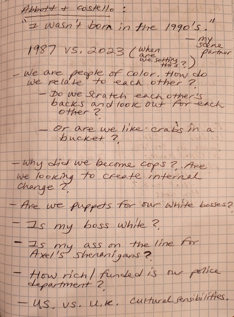 I remember my scene partner in the U.K. and I looking at the cultural differences between an American and an English person and how that can work its way into the dynamics of our relationship in “Beverly Hills Cop 2”. We looked at race and how that also affects our relationship since he and I are both people of color within this police department. We also devoted an entire rehearsal to researching Detroit, its police department, rankings within the department, crime statistics, etc. Keep reading below 🙂