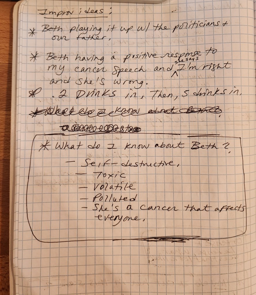 The first 40 percent of these two scene rehearsals was about research. For me, that entailed reading the script out loud over and over again with my scene partner. That entailed stopping and asking questions as we read the scene. That entailed looking up words and other things within the script that would help us make sense of the scene. That entailed writing ideas down. That entailed reading the scene out loud again and again with nothing on it and then reading it again and again with a singular choice in mind. That entailed identifying the Abbott and Costello (aka the differences) between my character and the other character. That entailed filling out the character chart for these scenes and writing in my subtext, my emotional through lines, and my chapters…and then modifying those things several times as I discovered more about the event of the scene, my character, my relationship with the other character, etc. I took notes during each rehearsal and gave myself homework to advance myself before the next rehearsal. Keep reading below 🙂